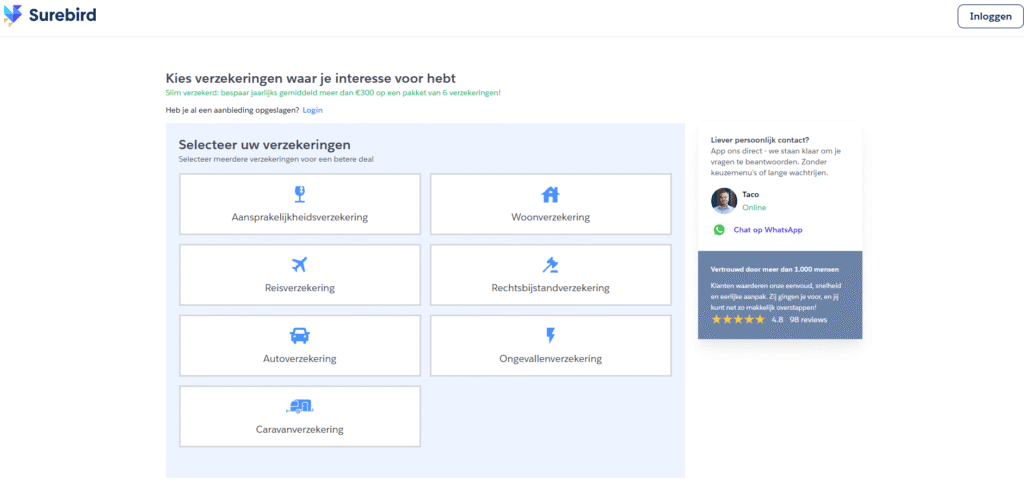 Je vult één keer je gegevens in: je leeftijd, type auto (als dit op jou van toepassing is), je woning en je wensen, en Surebird checkt automatisch bij tientallen verzekeraars waar jij de beste deal kunt krijgen. Binnen een paar minuten zie je welke verzekering het goedkoopst én het beste aansluit op jouw situatie.